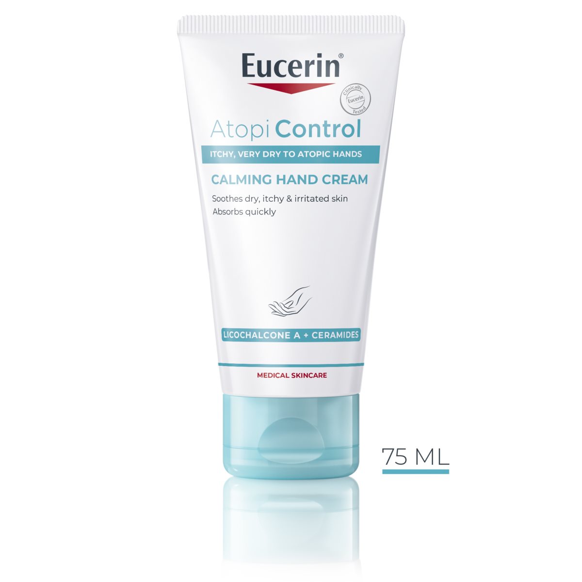 Eucerin AtopiControl Crema de Manos Calmante calma y suaviza la piel. La fórmula no grasa, que se absorbe con rapidez, contiene un complejo de ingredientes activos único con el calmante licocalcón A, el decanediol y el mentoxipropanediol (MPD). Este complejo, combinado con una alta concentración de ceramidas y Avena Sativa (avena), actúa como un potente hidratante para las manos, fortalece la barrera cutánea, alivia la sequedad y reduce la sensación de picor.