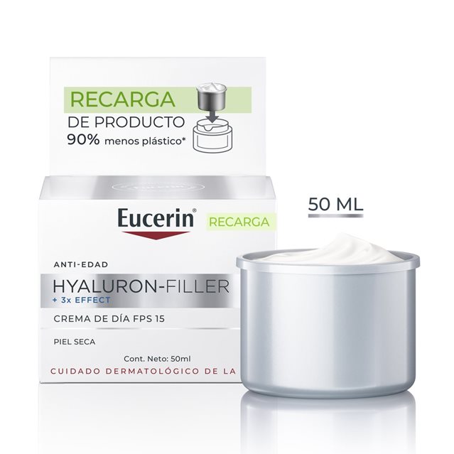 Eucerin Hyaluron-Filler Día FPS 15 para piel normal y mixta hidrata eficazmente la piel y es no comedogénico.