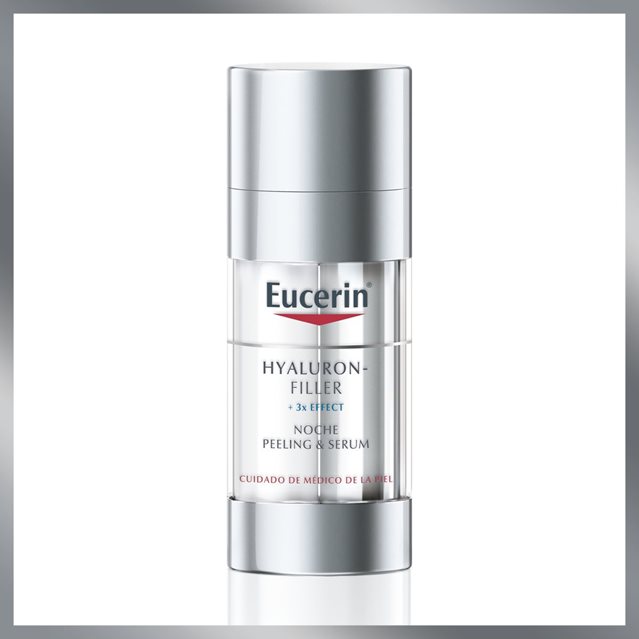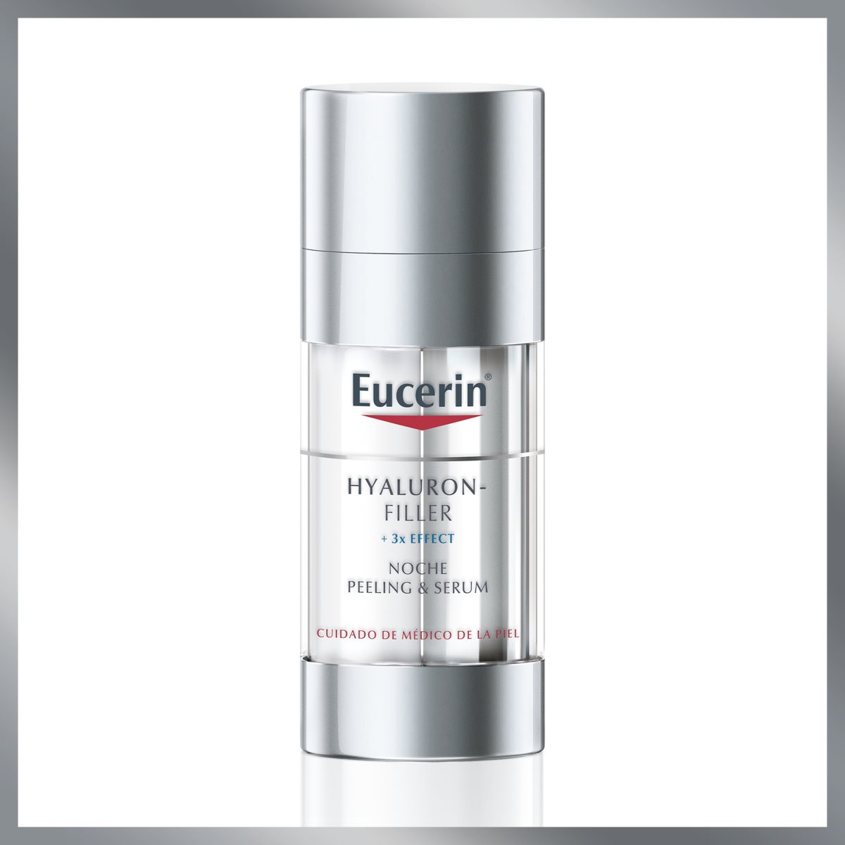 En dermatología, las inyecciones de Ácido Hialurónico y los peelings faciales se utilizan para combatir los signos del envejecimiento. Inspirado en estos tratamientos, Eucerin Hyaluron-Filler Noche Peeling & Serum combina dos potentes fórmulas que contienen múltiples beneficios rejuvenecedores: