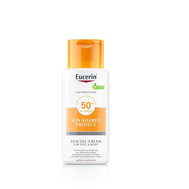 Eucerin Sun Allergy Protect Gel-Cream FPS 50+ es un protector solar para cara y cuerpo especialmente formulado para piel sensible al sol y piel propensa a las alergias solares como la erupción polimorfa lumínica (PLE).