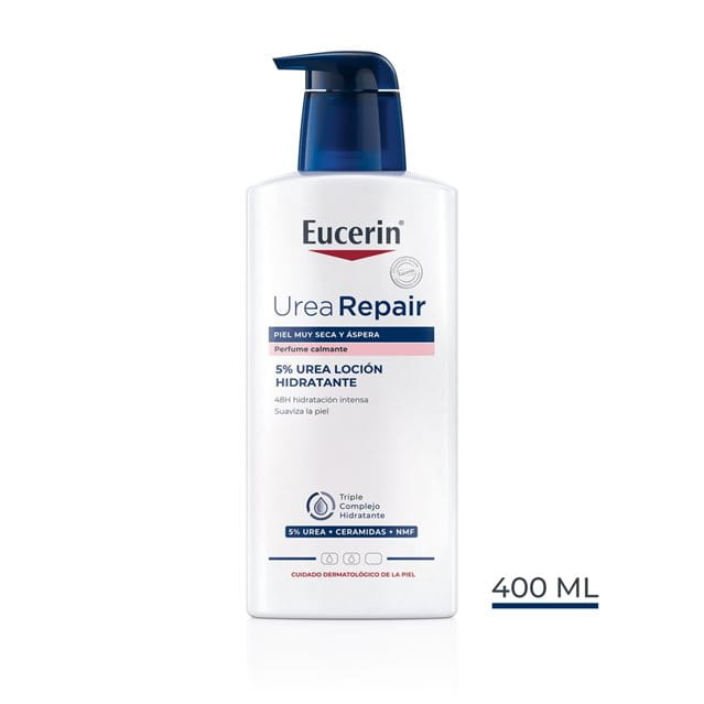 Eucerin Lotion UreaRepair PLUS 5 % Urea con perfume calmante contiene urea y otros factores naturales de hidratación (para retener el agua en la piel) y ceramidas (para reparar la barrera de la piel y reducir la pérdida de hidratación). La fórmula proporciona un alivio inmediato y retrasa los síntomas de la piel muy seca (como aspereza y descamación) durante al menos 48 horas.